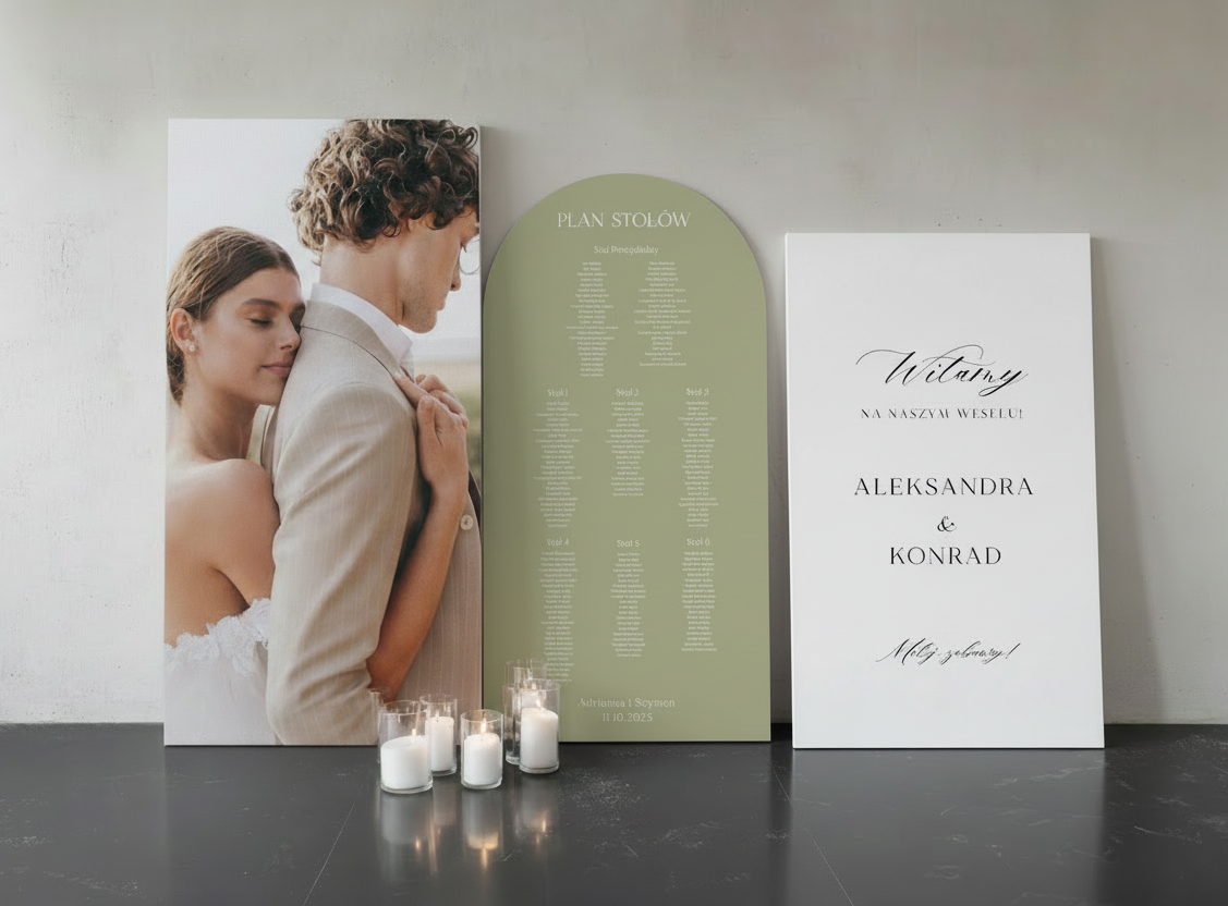 Zestaw zdjęcie + plan stołów + tablica powitalna